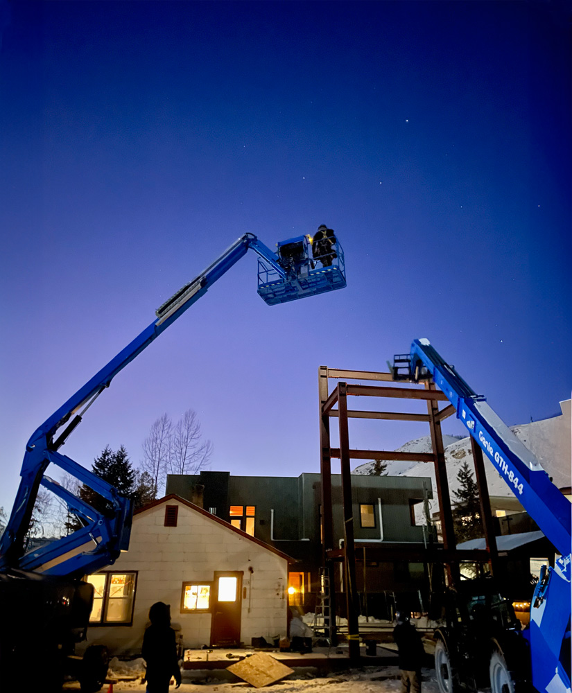 The result is a slender, vertically inclined three story dwelling that embraces the historic cottage while framing panoramic views of Jackson Hole in every direction. Strategically positioned behind the original structure, the new home respects the cottage’s primary façade. Its gradual height increase ensures a subtle streetside presence through a series of setbacks, which minimizes visual impact and provides a series of exterior decks that open the house to the exteriors in all directions.