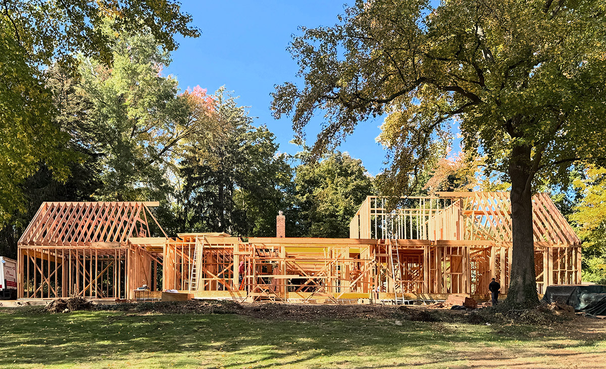 Its elongated, gently sloping roofline echoes the original house and blends in with the neighborhood. The exterior materials similarly embraces the historic requirements of the local design guidelines: cedar shake, slate roof, divided lite windows, and classic shutters. Yet, the traditional massing and finishes are presented in a sophisticated, monochromatic white, reflecting a modern minimalist aesthetic.