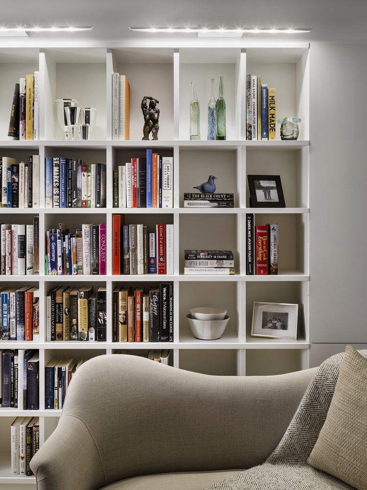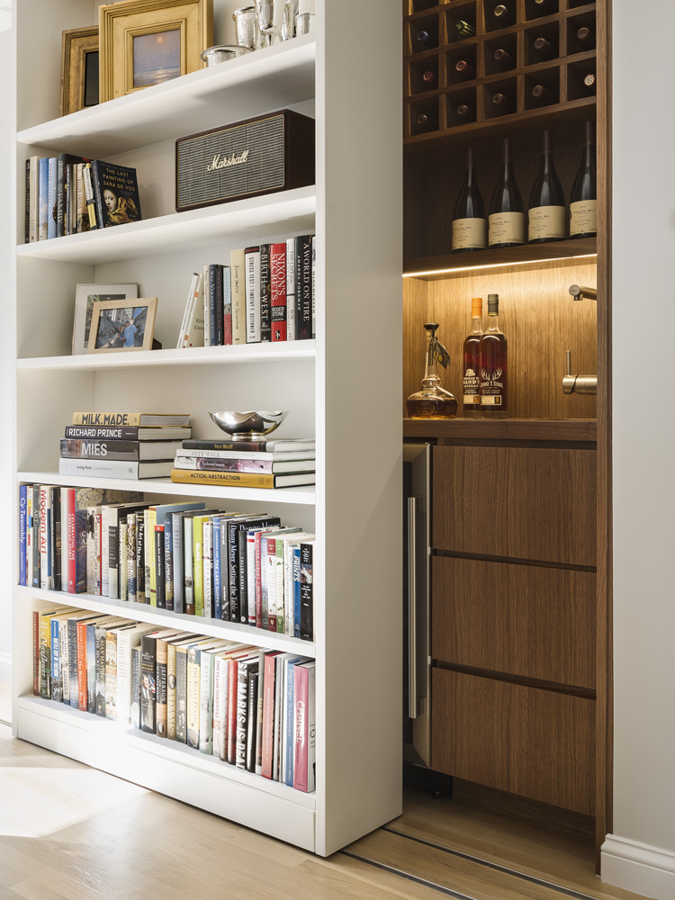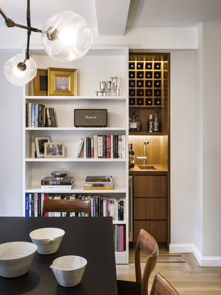 The intimate spaces are accentuated through lowered ceilings, strategically placed lighting, and bespoke cabinetry finished in rich walnut and stone, ensuring efficient use of the smaller areas. This includes an unexpected sliding bookshelf that conceals a secret wet bar in the living room.