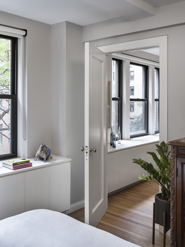 Designed for a young couple, the residence is located in a pre-war building designed by Emory Roth in 1932. The labyrinthine combination unit boasted a generous living space and large bedrooms along with a series of compact spaces - the kitchen, bathrooms, foyer, and hallway. The design balances these different types of spaces by creating a layout that flows naturally from grand spaces to intimate spaces, emphasizing their difference. The grand spaces, mainly the living room and bedrooms, are straightforward renovations of the original architectural detailing and are outfitted with crisp white lacquer cabinetry that recedes into the background.