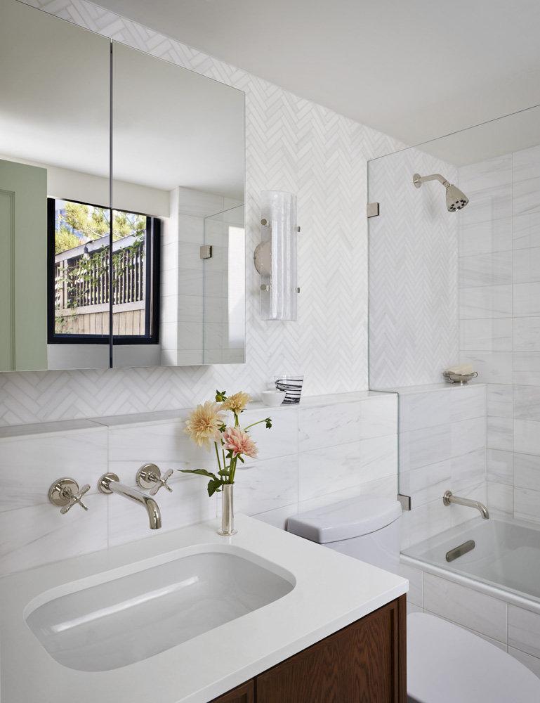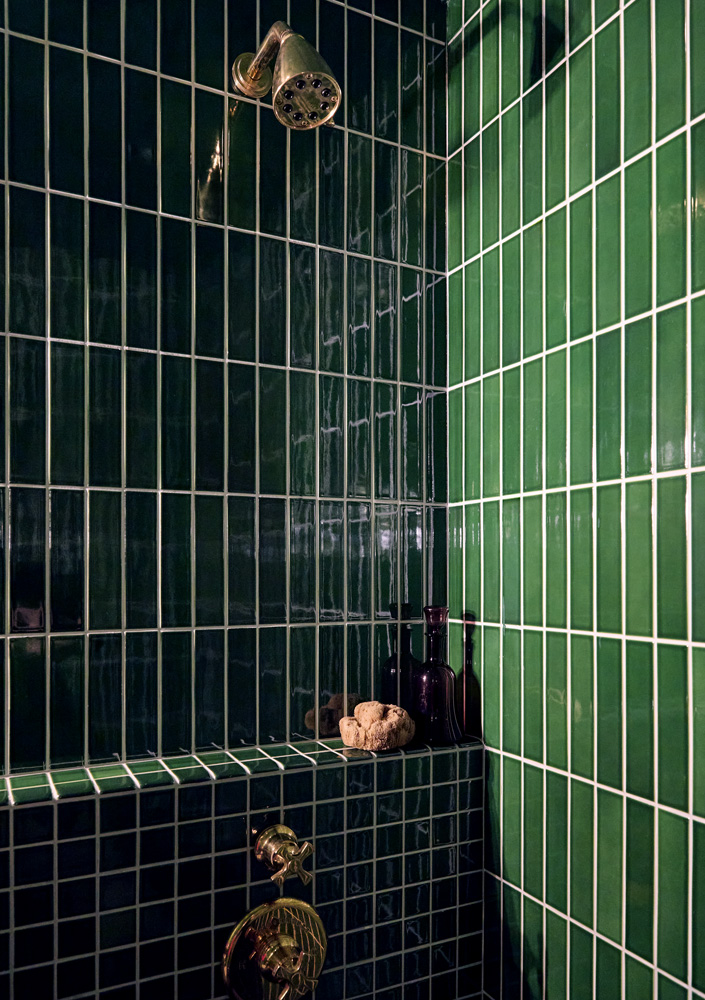 The two bathrooms are uniquely treated to reflect distinct atmospheres. One is enveloped in a saturated emerald green, creating a bold and sensory experience, while the other offers a serene retreat, featuring tranquil milky white marble that evokes calmness and elegance.