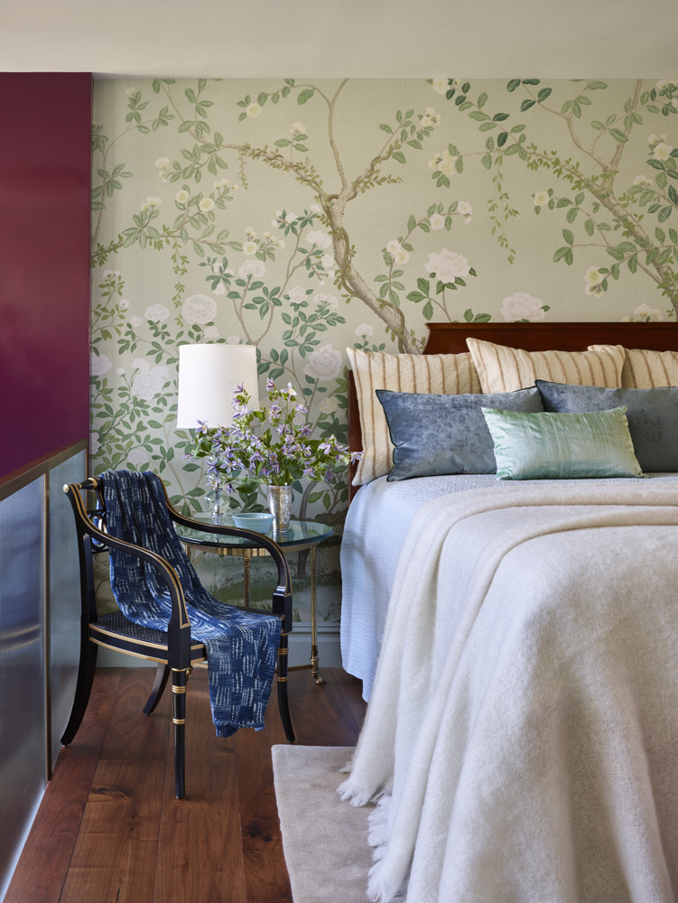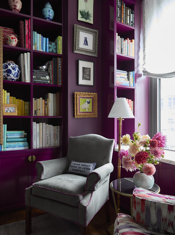 Embracing a Gothic Dorothy Draper style, the design incorporates a deep walnut flooring and cabinets along with rich colors - deep greens, purples, and pink - to create a moody and luxurious ambiance that harmonizes with the historic elements of the penthouse. This renovation not only preserves the architectural essence but also infuses it with the owner’s distinctive design sensibility.